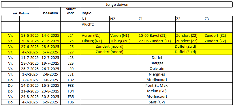 Zoals eerder op de vergaderingen gemeld starten we dit jonge duivenseizoen met 4 trainingsvluchten.